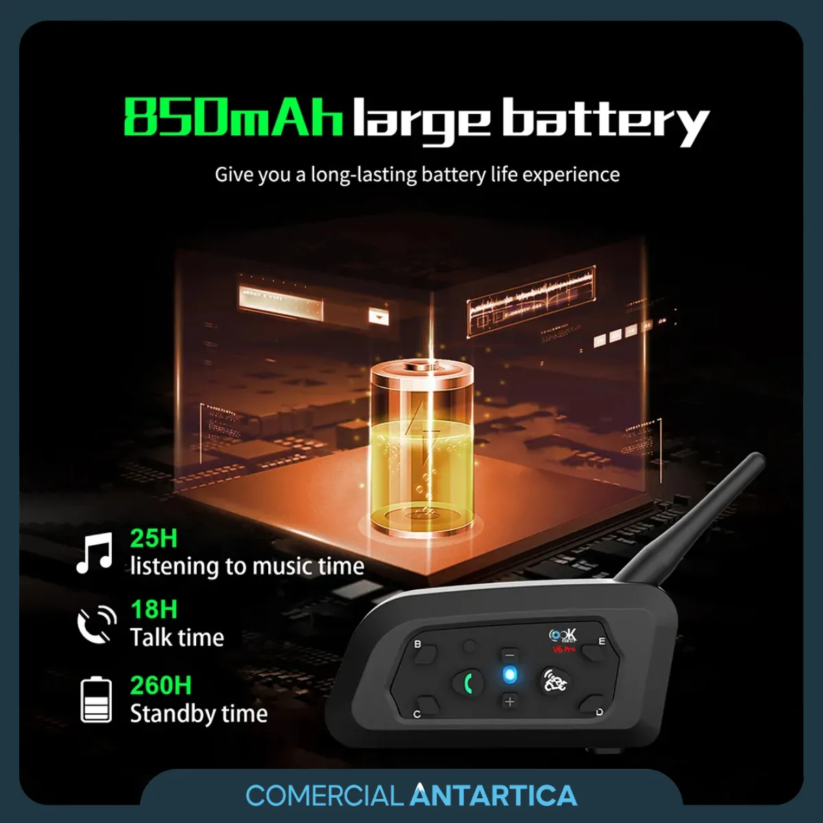 Compatible con hasta 5 dispositivos, este intercomunicador es ideal para viajes largos o conducción urbana. Su resistencia al agua y polvo (IP65) asegura funcionamiento confiable bajo lluvia o condiciones adversas, mientras que su batería recargable de 850 mAh brinda hasta 12 horas de uso continuo.