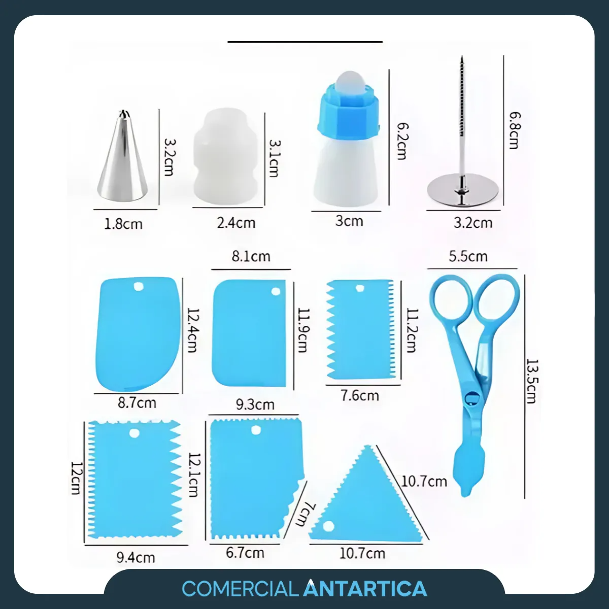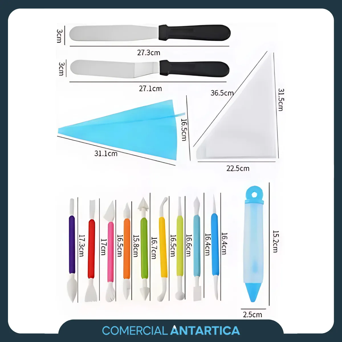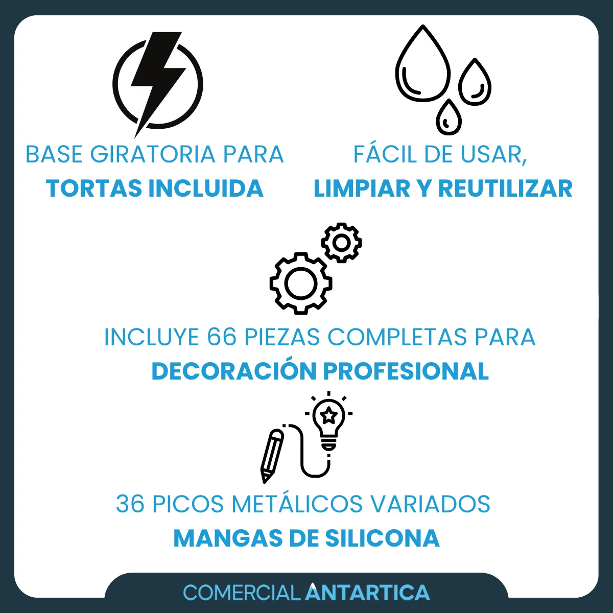 Incluye mangas de silicona, picos metálicos, espátulas, batidor manual y base giratoria para tortas.
